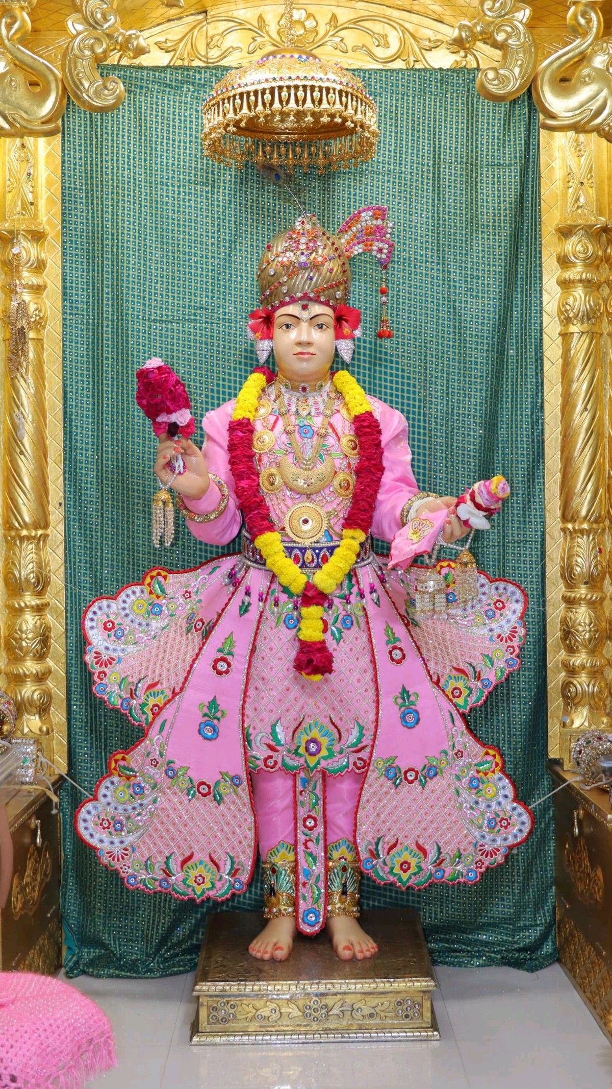 What a beautiful sight to behold! This divine image of Shree Swaminarayan, adorned with vibrant pink garments and delicate floral garlands, fills the heart with *bhakti*. The intricate details of His attire and the golden backdrop evoke a sense of reverence and peace. Imagine the joy of receiving *darshan* from such a radiant form! May Swaminarayan’s blessings always be with you. 🙏🌸✨ Make your phone a window to daily *darshan* and keep the divine presence close.