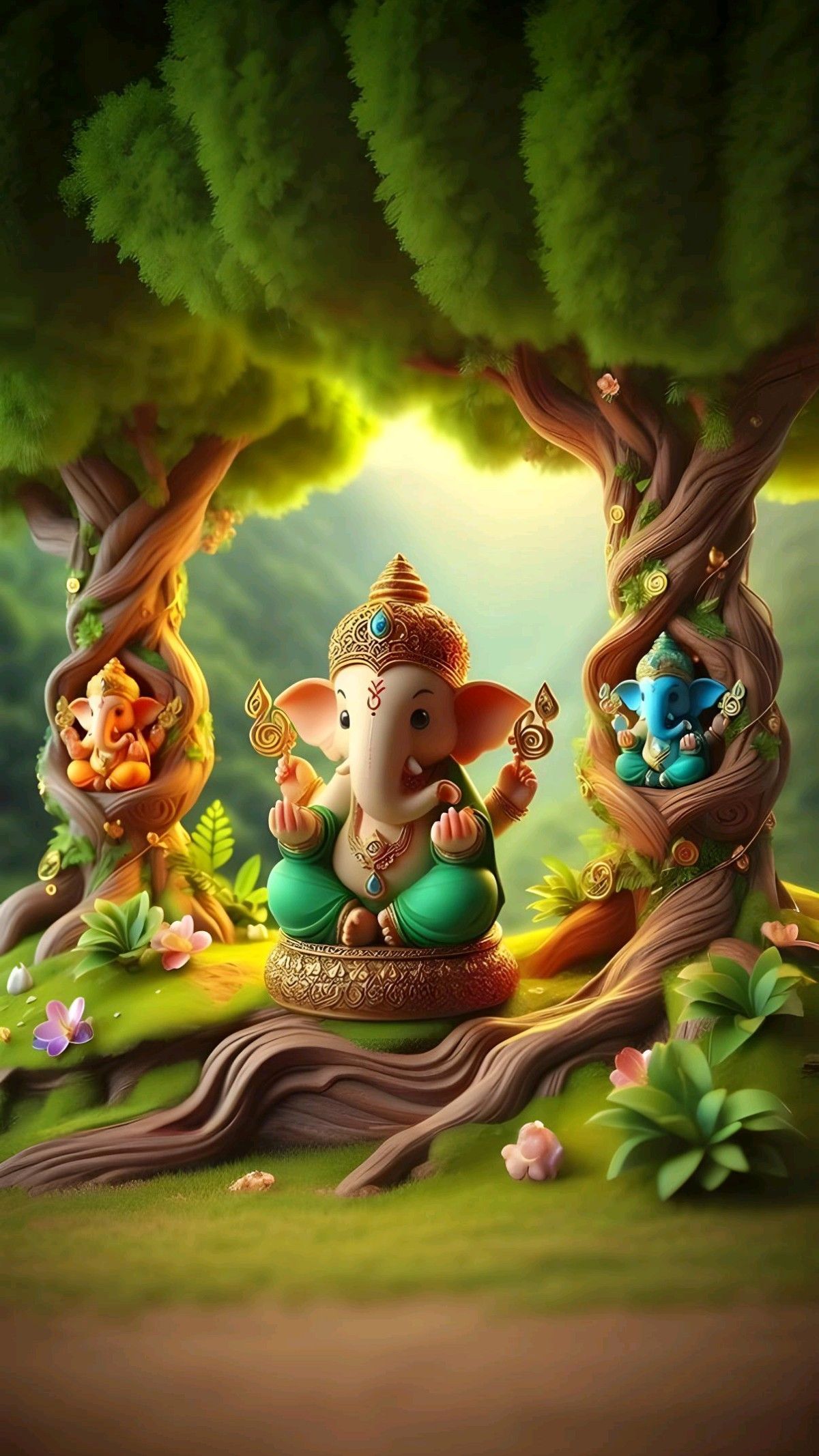 A wave of peace washes over you as you gaze upon this enchanting depiction of Ganesha amidst the lush greenery. The Ganpati Bappa, radiating serenity, is nestled amongst the ancient trees, accompanied by his playful companions. The light filtering through the canopy creates a magical darshan, reminding us of the divine presence in nature. May this image bring blessings and positivity to your day. 🙏✨🌸