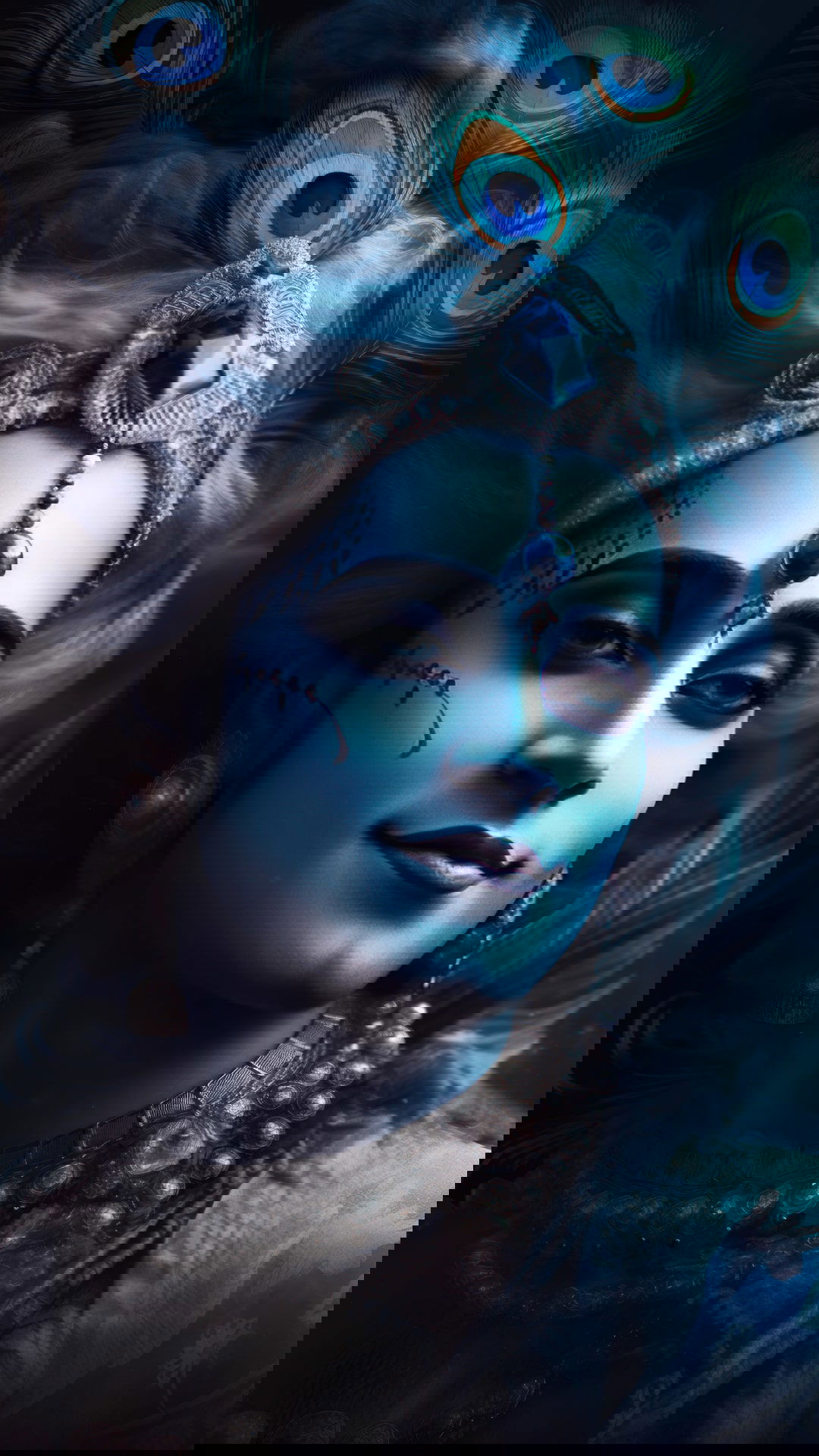 What stories are held within the depths of Kanhaiya’s captivating eyes? This stunning portrait captures the ethereal beauty of Lord Krishna, adorned with a majestic peacock feather and intricate jewelry. The deep blue hue of his skin radiates a sense of peace and divine energy. May this image bring a moment of *darshan* and fill your day with *bhakti*. Let Murli Manohar grace your screen with his presence! 🕉️✨💙