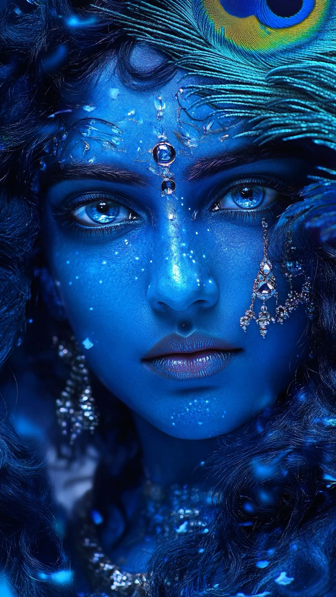 A sense of profound peace emanates from this captivating portrait of Krishna. The mesmerizing blue hue of his skin, accentuated by delicate sparkles, draws you into a realm of divine bliss. You can almost feel the gentle melodies of his *bansuri* resonating in your heart. The intricate jewelry and the subtle presence of a peacock feather—a symbol of beauty and grace—only amplify the enchantment. This image isn’t just a depiction, it’s an invitation to experience the divine presence of Murli Manohar in your daily life. Make your phone a window to *darshan* and let Krishna’s serenity fill your days. 🕉️✨💙
