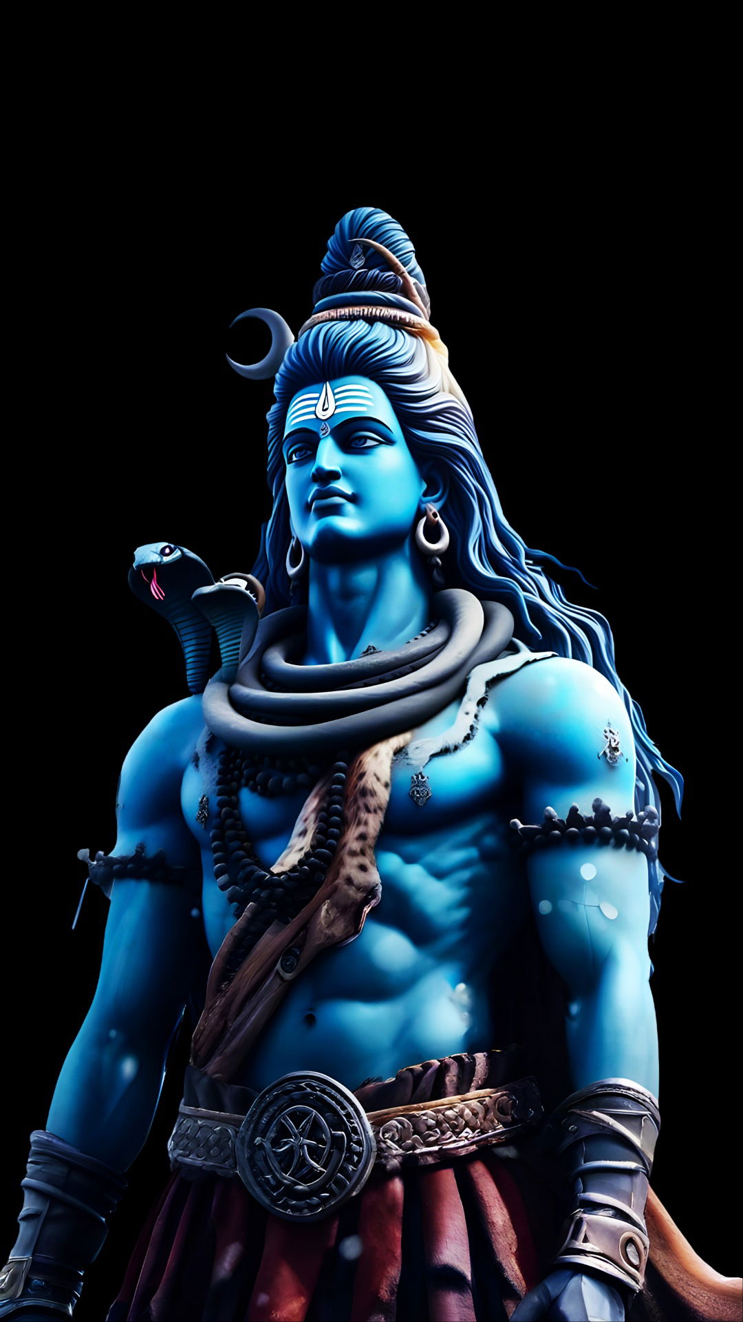 What stories does the serenity in Mahadev\'s eyes tell? This magnificent portrait of Lord Shiva, or Mahadev as he\'s lovingly called, radiates an aura of profound peace and power. The divine blue hue, the cascading matted locks, and the watchful serpent all speak to his cosmic nature. The subtle details of the damru and crescent moon emphasize his role as the destroyer and the creator. May this image bring a touch of that divine *shakti* into your life, offering you moments of quiet contemplation and inner strength. Make your phone a window to daily *darshan* with this powerful image! 🕉️✨🙏