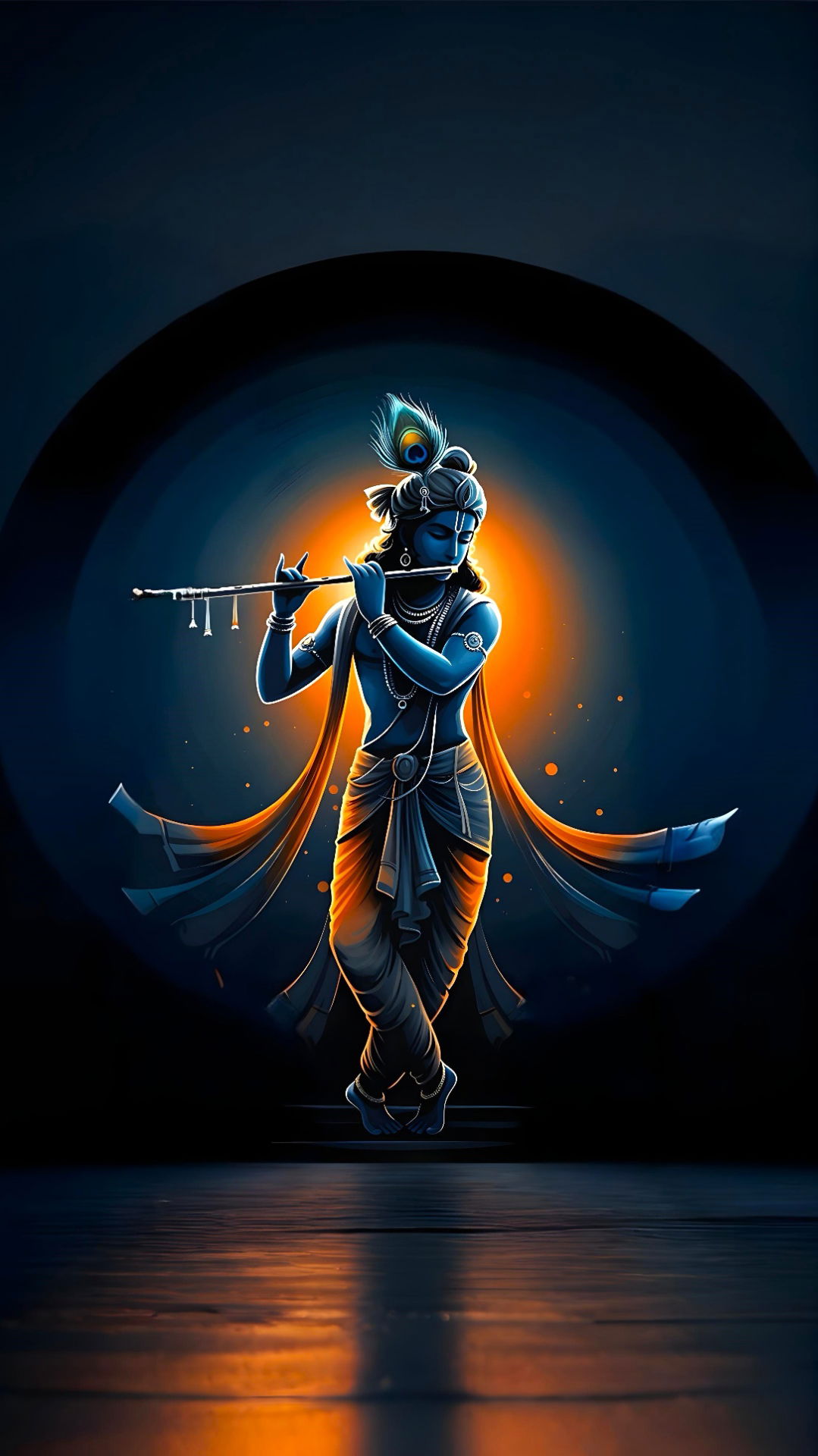 A sense of profound peace emanates from this image of Kanhaiya, lost in the sweet melody of his flute. The deep blues and fiery oranges create a captivating contrast, drawing you into a world of divine bliss. Feel the *leela* of Murli Manohar with every glance, and let his music fill your soul with *bhakti*. May this be a source of daily *darshan* for you. 🕉️✨🙏