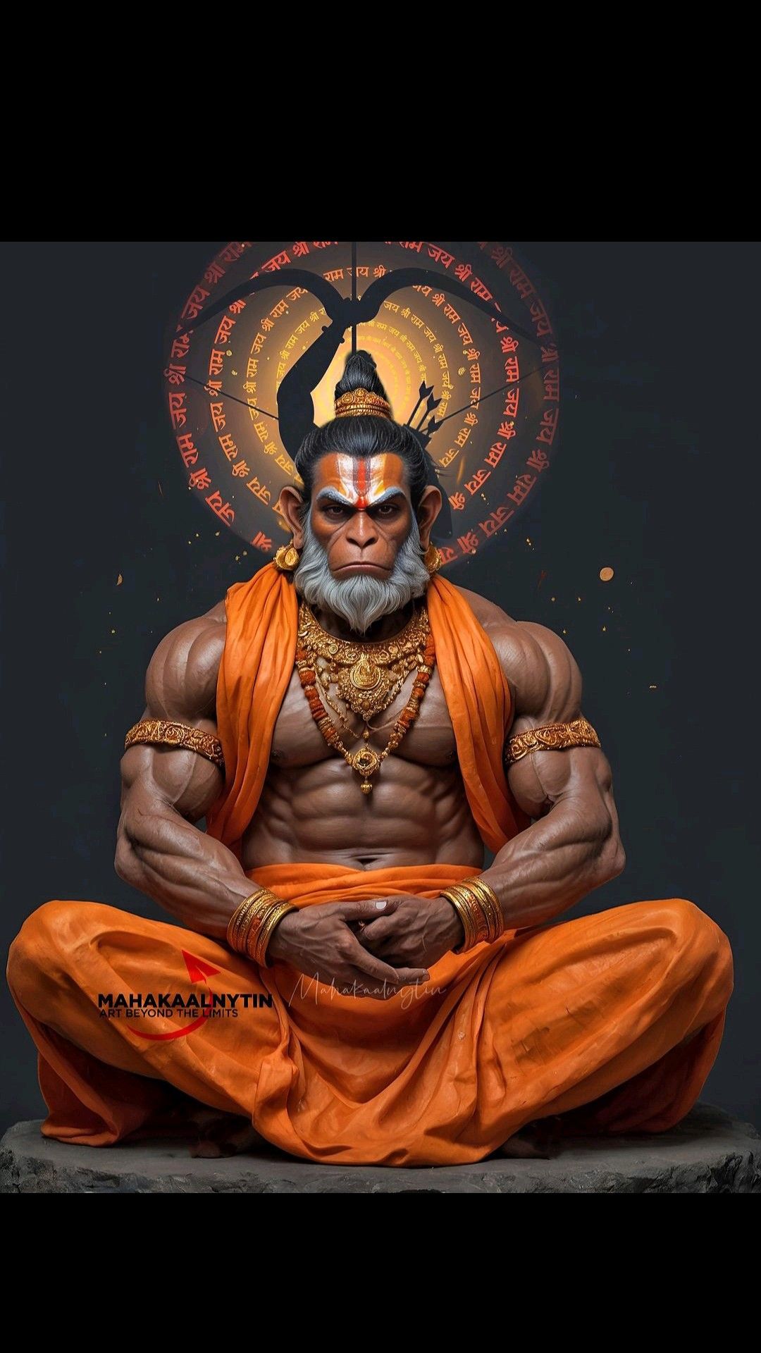 What a magnificent sight! Hanuman, the mighty Pavanputra, emanates strength and devotion in this stunning artwork. Look at the intensity in his eyes, the beautifully detailed gold jewelry, and the confident posture as he rests upon the lotus. The \'Jai Shri Ram\' mantra surrounds him, a constant reminder of his unwavering *bhakti* for Lord Ram. May this image bring you peace and remind you of the power within! ✨🙏 Make your phone a source of daily *darshan* with this powerful image. 🧡