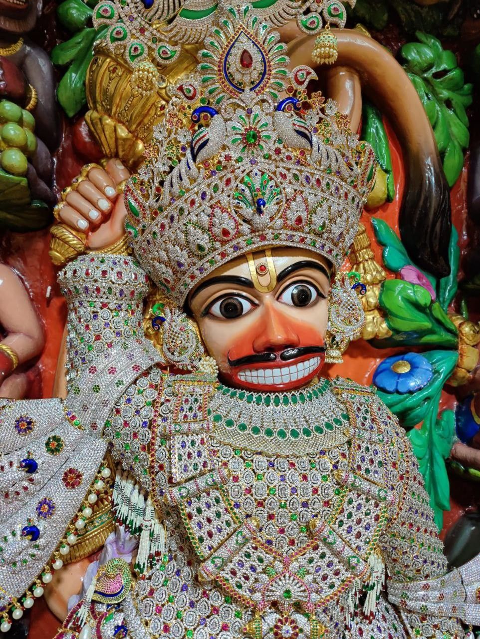 What a stunning depiction of Sankatmochan Hanuman! The intricate details of his crown and ornaments truly capture the devotion and strength of this beloved deity. His powerful gaze seems to pierce through the image, offering a sense of unwavering protection and *bhakti*. May this image fill your phone with positive energy and provide daily *darshan*. 🙏✨ Hanumanji is always there to help us through life\'s challenges. 🌺