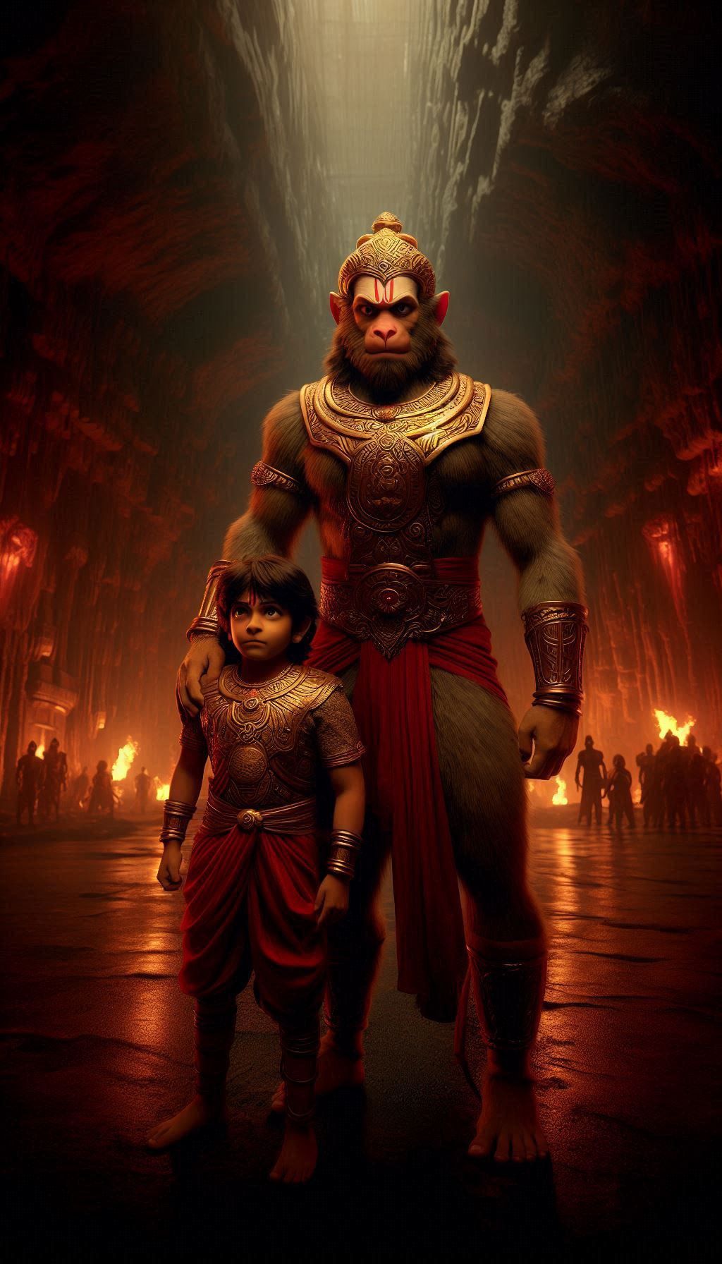 What unwavering strength radiates from Pavanputra in this depiction! Hanuman, the mighty devotee, stands as a protector alongside a young prince – a scene brimming with *shakti* and the promise of courage. The fiery backdrop echoes the battles fought and won in the name of *dharma*. Feel the power of Bajrangbali\'s presence, and let this image inspire you with devotion. Make your phone a window to daily *darshan* and invite this divine energy into your life! ✨🙏🔥