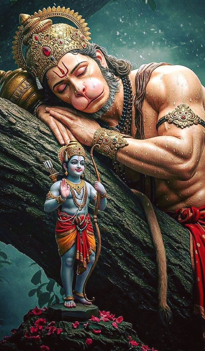 A sense of profound peace emanates from this depiction of Pavanputra Hanuman. Here, Bajrangbali rests, his immense strength temporarily subdued in peaceful slumber. Look at the delicate details β the beads of water clinging to his powerful form, the tender devotion of Shri Ram standing nearby. This image isn\'t just about physical strength; it\'s a reminder that even the greatest of devotees need moments of quiet reflection. May this image bring you *darshan* and a moment of calm in your day. ππΈβ¨