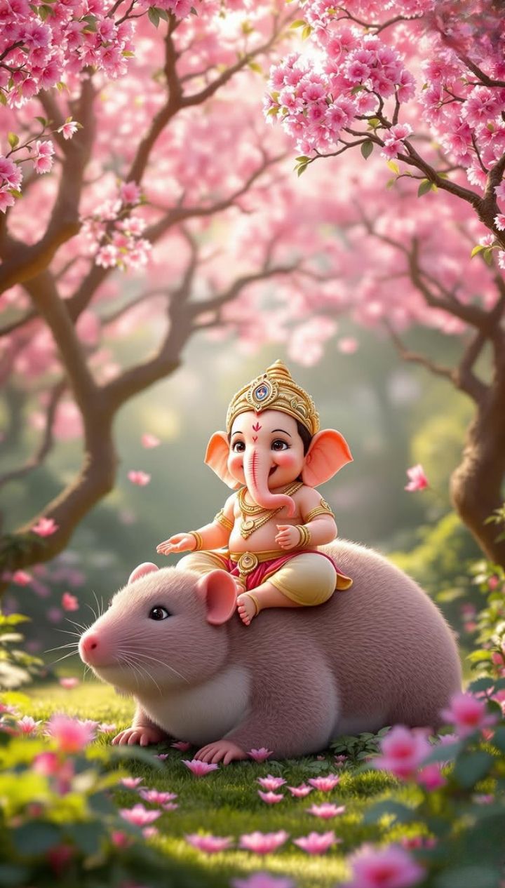 What a delightful sight! Little Ganpati, our beloved Vighnaharta, sits peacefully upon his vahana, the mouse, surrounded by a cascade of delicate pink blossoms. The air feels full of blessings and joy, doesn\'t it? This image captures the playful *leela* of Bal Ganpati in a way that will surely bring a smile to your face and fill your day with divine energy. May this image be a constant source of *darshan* and inspiration on your phone! 🌸🐭✨