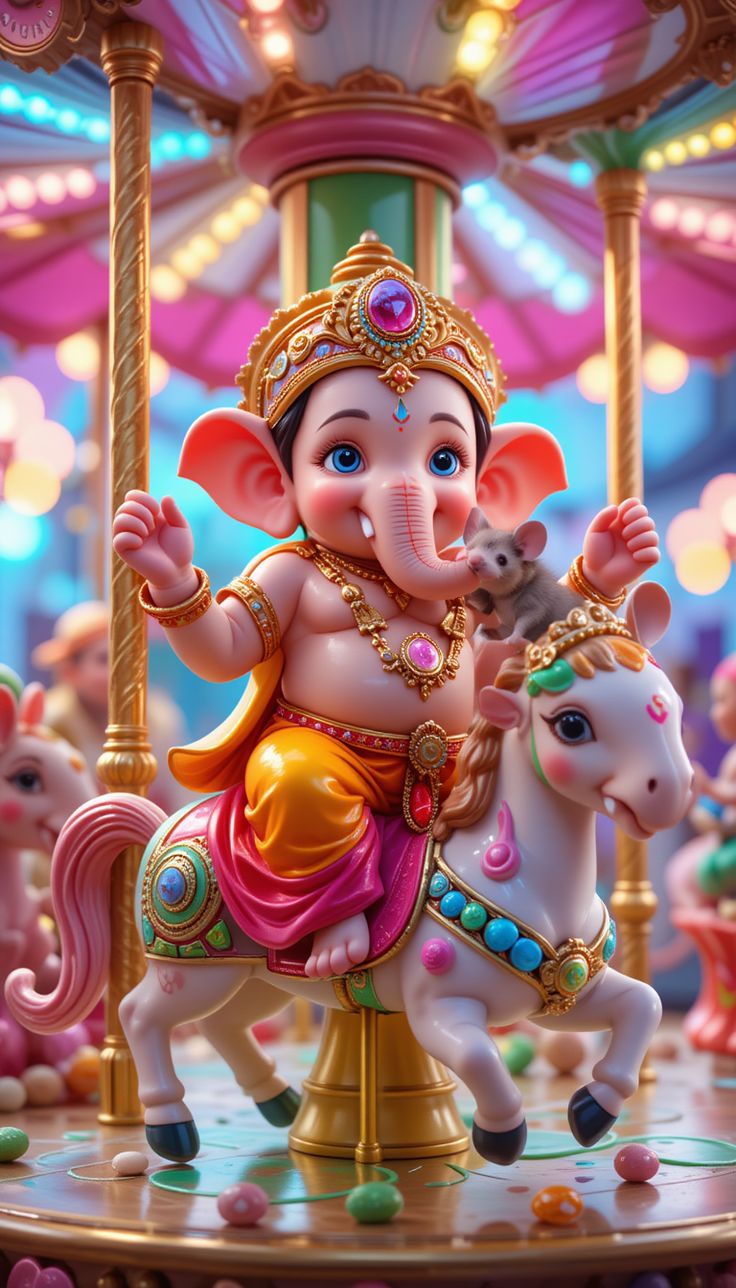 What stories does this delightful image of Ganesha tell? Little Ganpati, our beloved Vighnaharta, is enjoying a joyful ride on a carousel horse, with his loyal mouse companion by his side! The vibrant colors and playful scene truly capture the *leela* of this auspicious deity. Feel the blessings of Shri Ganesha brighten your day and transform your phone into a source of daily *darshan*. 🕉️✨💖🙏