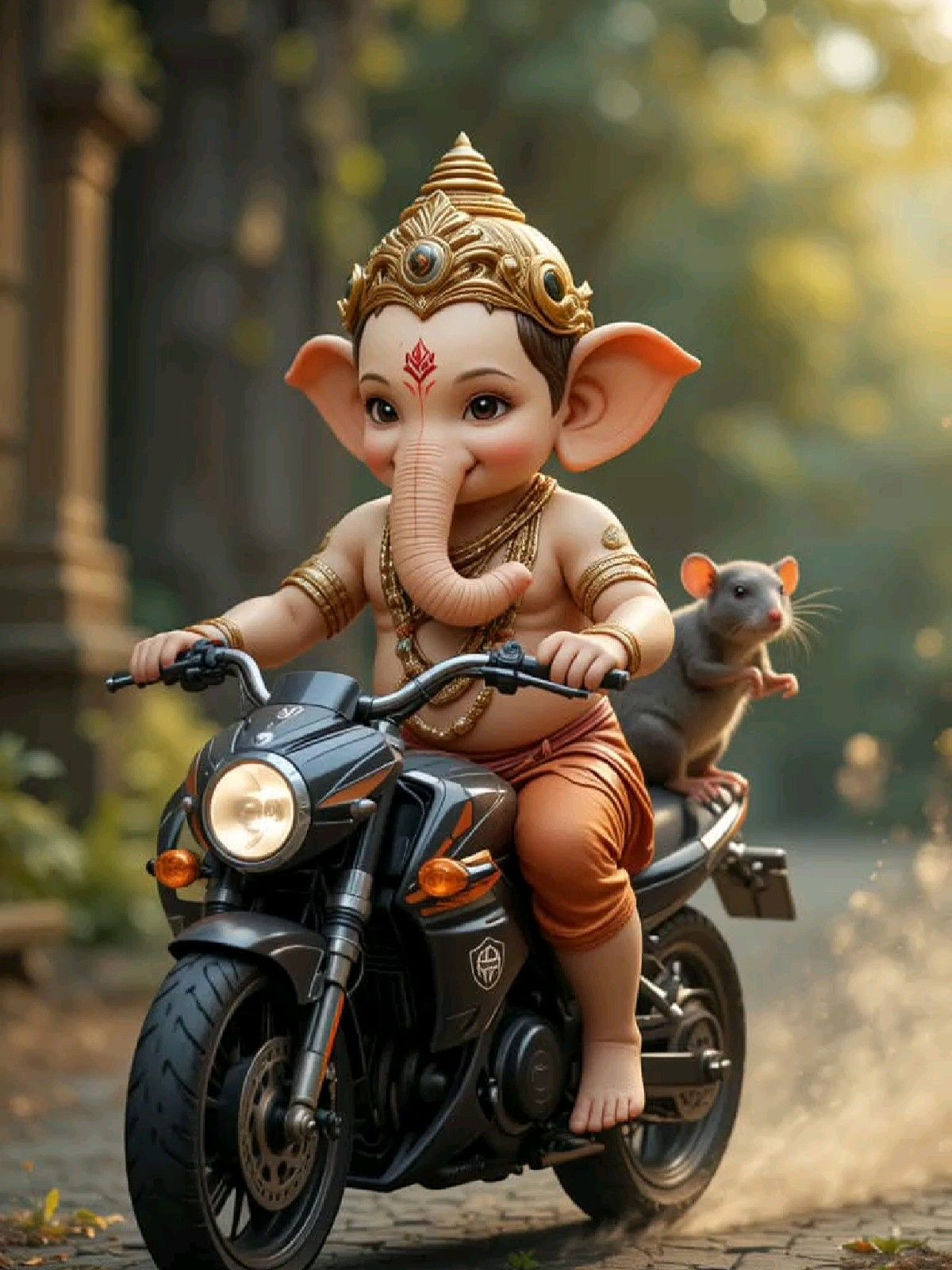 What a sight! This image depicts the adorable Bal Ganpati taking a joyride on a sleek motorcycle, with his loyal mouse friend hitching a ride. The vibrant colors and playful energy of this artwork are truly captivating. It\'s a beautiful reminder that even the Remover of Obstacles enjoys a bit of fun! ✨ May this image bring a spark of joy and *shakti* to your day, and may the blessings of Vignaharta always be with you. Make your phone a source of daily *darshan* with this delightful image! 🙏💖🛵