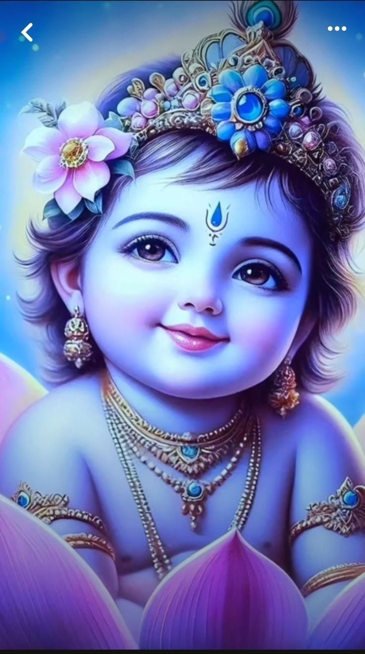 A sense of profound peace emanates from this image of the divine Bal Krishna. Look into those enchanting eyes—they seem to hold the secrets of the universe! The little Kanha, adorned with exquisite jewels and a shimmering peacock feather, rests peacefully upon a lotus, radiating bhakti and love. Let this charming darshan fill your day with grace and joy. May his leela bring positivity to your phone! ✨🙏💖