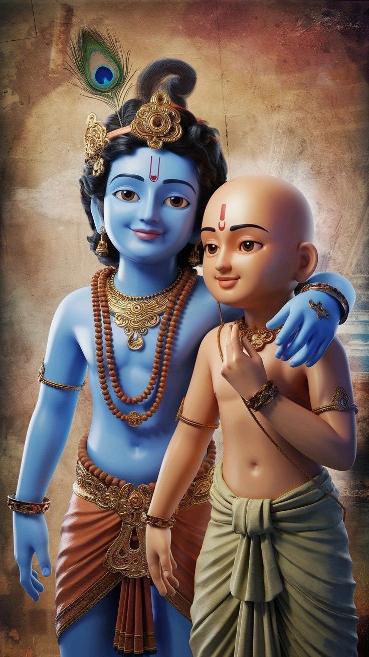 A sense of profound peace emanates from this delightful image of young Kanhaiya with his friend. Look at the adorable mischievous glint in their eyes! The divine duo, adorned with golden ornaments and a vibrant peacock feather, radiate *shakti* and *bhakti*. May this *darshan* fill your phone with positive energy and remind you of the sweetness of childhood and the boundless love of Krishna. ✨🙏💖 Let your phone be a window to the divine, always!