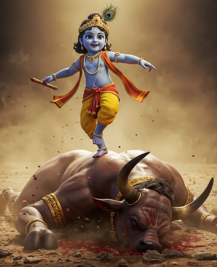 What a delightful scene! Little Kanhaiya, full of mischief and divine energy, is shown here playfully subduing the bull, symbolizing his power even as a child. The vibrant colors and dynamic pose capture the *leela* of Krishna in Vrindavan perfectly. You can almost feel the joy radiating from this beautiful *darshan*. May this image fill your day with bhakti and a reminder of Krishna\'s playful spirit. 🕉️✨🙏