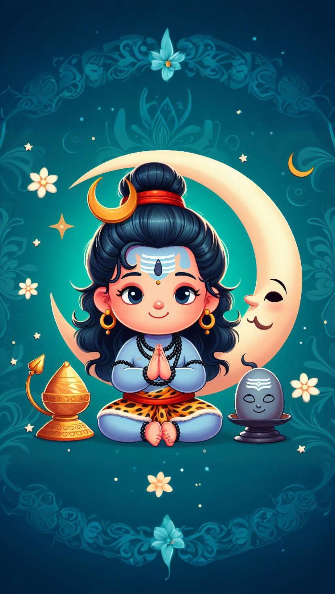 What stories does the gentle expression on little Shiva\'s face tell? This charming depiction of Mahadev as a Balak (child) radiates pure, divine joy. The crescent moon cradles Bholenath, while a tiny damru and shivling accompany his peaceful meditation. Let this sweet image bring a moment of *shakti* and serenity to your day, a beautiful *darshan* for your phone. 🕉️✨🙏