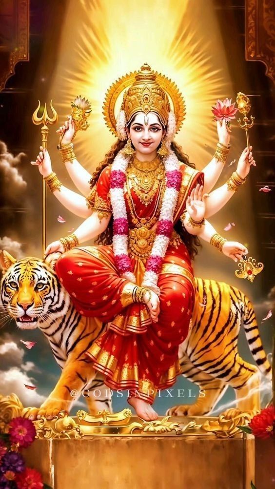 What stories do the eyes of Maa Durga tell? This stunning depiction showcases the divine Shakti, seated gracefully upon her loyal tiger vahana. The radiant glow, the delicate lotuses, and the powerful Trishul in her hands all speak to her strength and compassion. Feel the *shakti* and find daily *darshan* in this powerful image. ✨🙏🌺