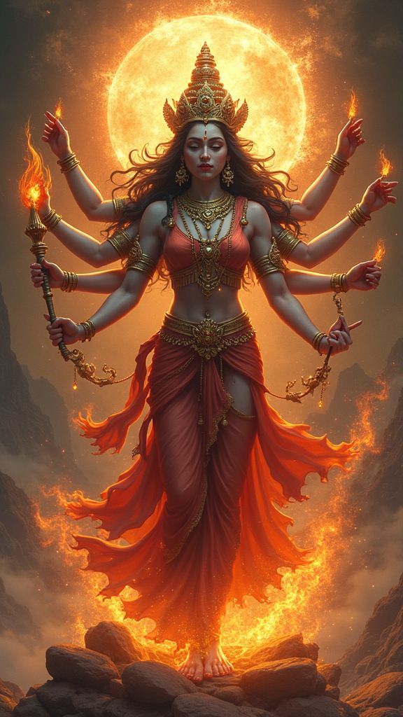 What stories does the fierce grace in Devi Parvati\'s eyes tell? This captivating image portrays Maa Parvati in all her Shakti, surrounded by the power of flames. The golden halo elevates her divine presence, reminding you of the strength and serenity within. Let the warmth of her energy fill your soul and inspire you each day. Make your phone a portal to daily darshan and feel the blessings of the Divine Mother. ✨🙏🔥💖