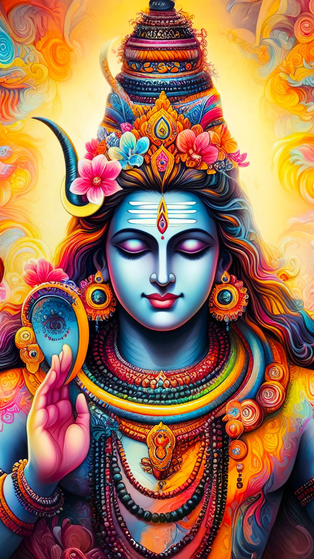 Behold the serene presence of Mahadev, radiating cosmic energy! ✨ His tranquil gaze and the gentle curve of his lips invite you into a space of profound peace and devotion. Look closely at the intricate floral arrangements adorning his matted locks, each petal whispering tales of creation and destruction. 🙏 As you gaze upon this breathtaking artwork, may you feel the protective embrace of Bholenath and find solace in his divine grace. May your phone be a constant reminder of his blessings and a portal to daily *darshan*. 🕉️