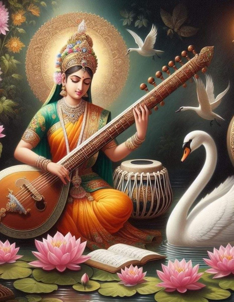 Can you imagine the divine melodies flowing from Saraswati Maa’s veena? This beautiful depiction shows the goddess of knowledge and music immersed in her art, with graceful swans and blooming lotuses surrounding her. She is truly the embodiment of *shakti* and creative energy. May this image fill your phone with blessings and inspire your own creative endeavors. Let your daily *darshan* begin! 🌸🦢✨