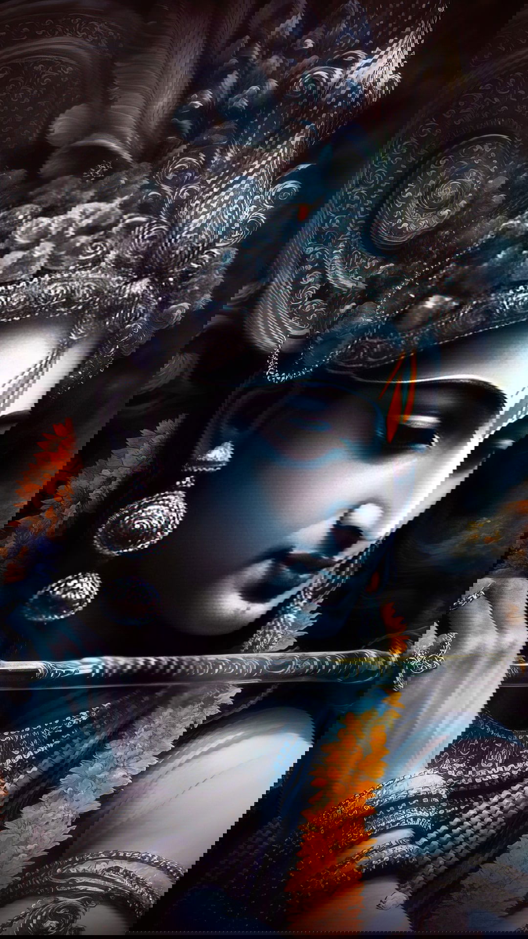 A sense of profound peace emanates from this portrait of Kanhaiya. The gentle curve of his flute, the *bansuri*, hints at the enchanting melodies that captivate the hearts of all devotees. Look at the intricate detailing in his crown and the delicate placement of the peacock feather, *mor pankh*, a symbol of beauty and grace. May this image fill your phone with divine *shakti* and remind you of Krishna\'s eternal *leela* every day. It\'s a beautiful *darshan* for your soul! πΈβ¨π