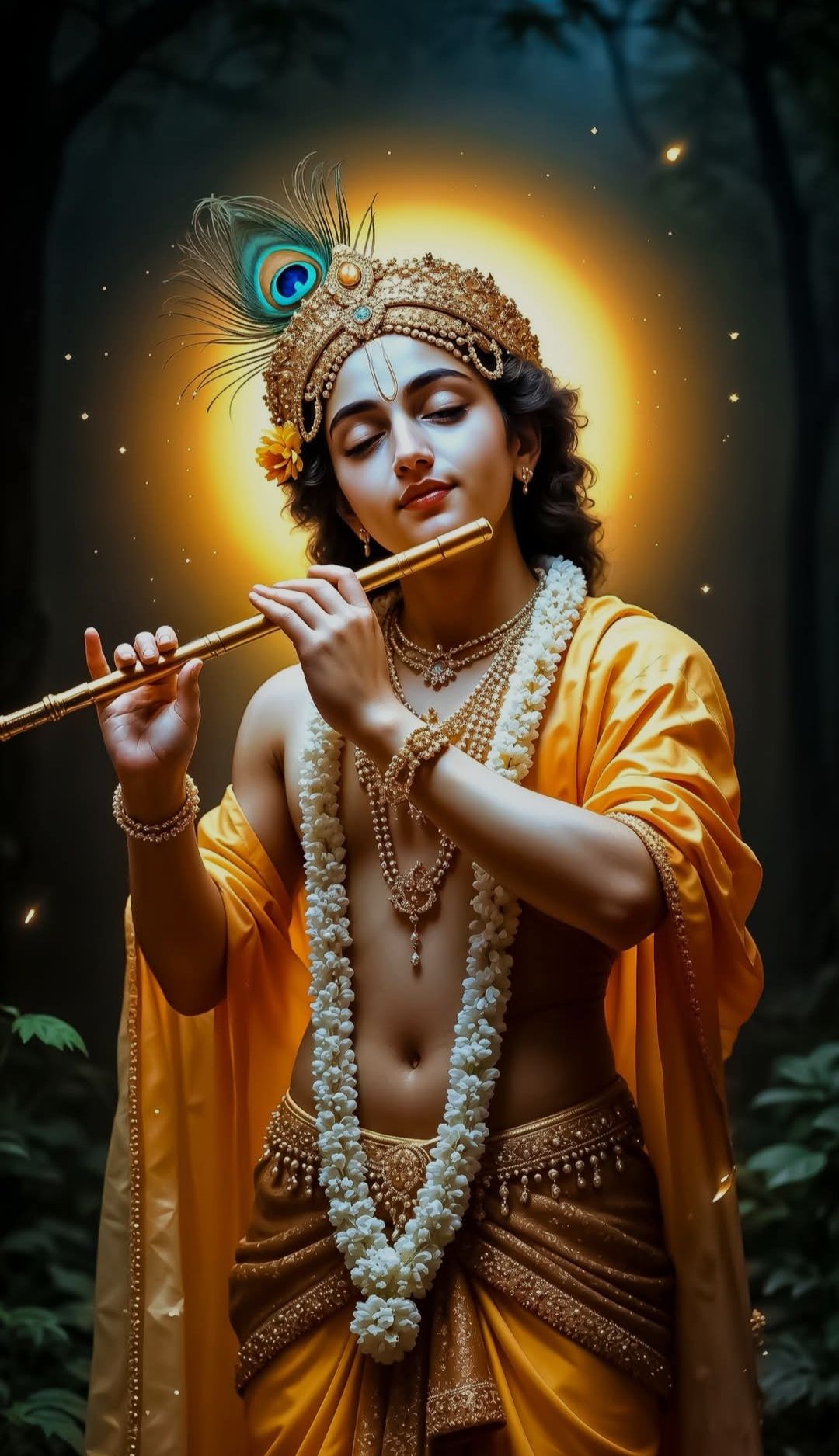 What stories does the gentle curve of Kanhaiya\'s flute whisper to your soul? This stunning portrait captures the divine Murli Manohar amidst a lush, enchanted forest, radiating peace and serenity. The golden glow around his form and the delicate mor pankh in his mukut amplify his celestial beauty. Let this image fill your phone with bhakti and remind you of the playful leela of Krishna. Make your phone a window to daily *darshan* with this captivating image! 🕉️✨💖