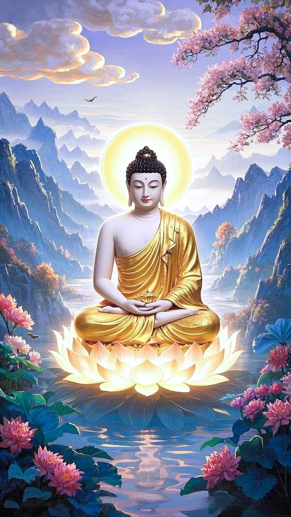 A sense of profound peace emanates from this stunning depiction of the Tathagata. Here, Shakyamuni Buddha sits in peaceful meditation, his golden aura illuminating the mountain landscape. The gentle hues and serene expression invite you to find stillness within your own heart. Let this image be a reminder of the path to enlightenment and a source of daily *darshan*. 🙏 ✨ 🧘 🌸