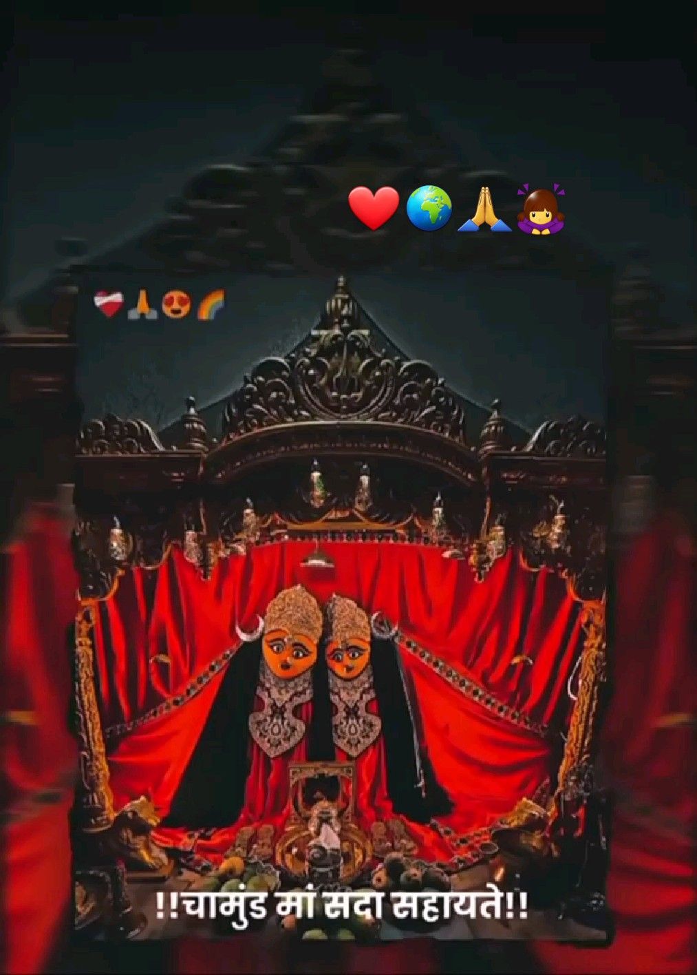 Behold the magnificent presence of Chamunda Maa, radiating strength and serenity from her temple abode! ✨ The rich crimson hues surrounding the divine mother create a powerful aura, inviting you into a space of deep bhakti. This image is a reminder of Maa Chamunda\'s unwavering support and her shakti that protects us all. May her blessings shower upon your life and fill your days with peace and darshan. 🙏 Make your phone a sacred space with this image of the divine mother! 🕉️🌹