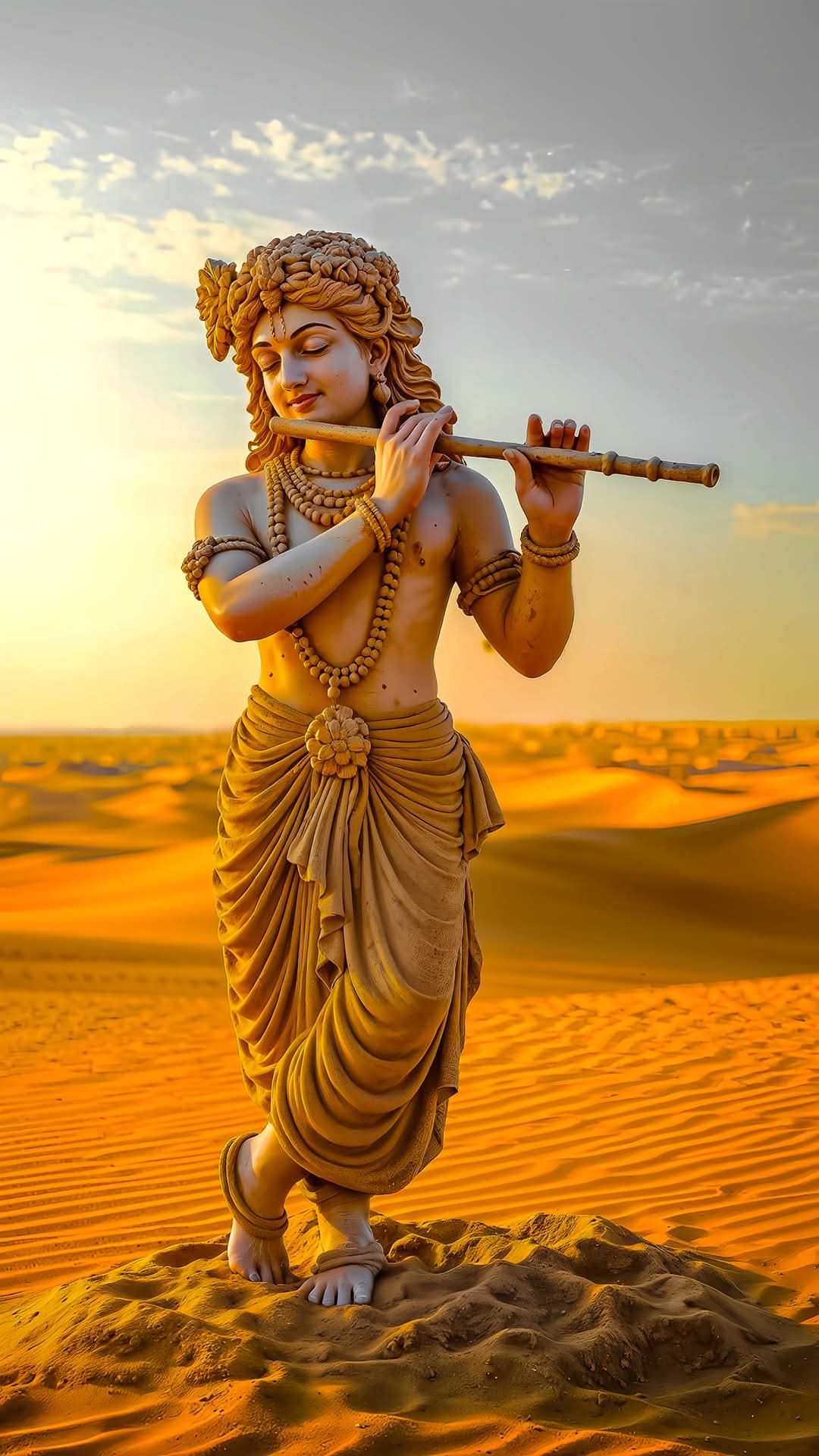 What stories does the gentle melody of Kanhaiya’s flute whisper across the golden sands? ✨ This captivating image showcases Lord Krishna, the divine musician, amidst a breathtaking desert landscape. Feel the peace and serenity of His *leela* wash over you. The warm hues and sculpted details create a truly enchanting *darshan*. Let this be a reminder of the divine music within us all. 🙏 Make your phone a window to the divine with this beautiful depiction of Sri Krishna. 🧡