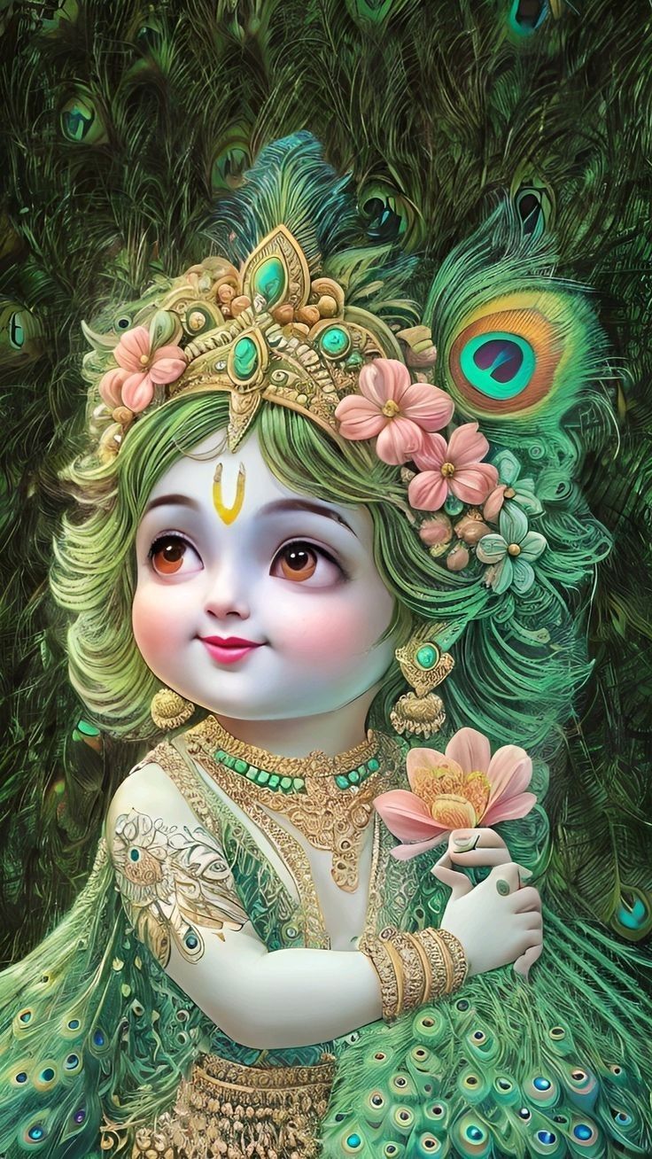 Look at the sweet innocence radiating from little Kanhaiya’s eyes! This enchanting portrait captures Bal Krishna amidst a lush backdrop of peacock feathers, his favorite. The delicate flowers adorning his crown and the gentle curve of his lips evoke a feeling of pure bhakti. May this darshan fill your day with joy and divine blessings, reminding you of the playful leela of the Lord. Add a touch of divine grace to your phone with this beautiful image of Murli Manohar! 🌸✨🙏