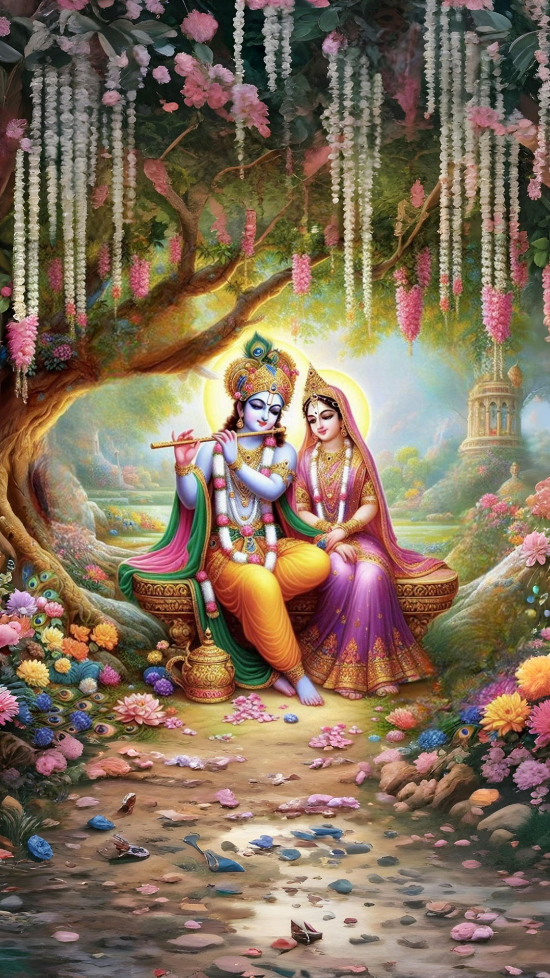 What stories does the vibrant foliage surrounding Radha and Krishna whisper? This image captures the divine couple, Kanhaiya and Radha, in a breathtakingly beautiful garden, lost in a moment of eternal love. The gentle curve of Krishna\'s flute suggests a melody that fills the very air with bhakti. May this image bring a touch of divine grace and unwavering faith to your day, reminding you of the power of love and devotion. Make your phone a window to daily darshan!πΈπβ¨