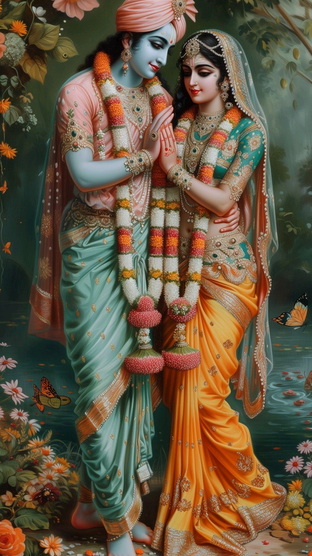 What a beautiful depiction of *prema bhakti*! This artwork captures a tender moment between Kanhaiya and Radha, radiating a divine love that touches the soul. Their eyes meet in a silent conversation, a promise of eternal companionship. The intricate details of their attire and the vibrant flowers surrounding them speak volumes about the richness of our culture. May this image bring peace and happiness to your day and fill your phone with the divine presence of Radha-Krishna. ππΈβ¨