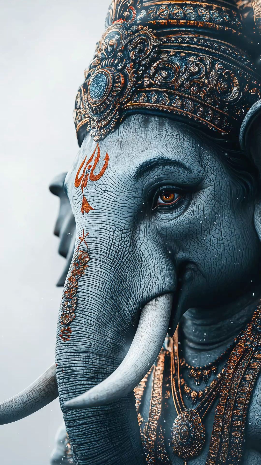 What wisdom does the intense gaze of Gajanan hold? This breathtaking close-up reveals the intricate details of Lord Ganesha’s majestic form, adorned with stunning golden ornaments. ✨ Feel the divine *shakti* radiating from this powerful image, a symbol of wisdom, prosperity, and new beginnings. May this picture bring *darshan* of Shree Ganesha to your phone every day, filling your life with blessings. 🙏🏼 Let the energy of Ekadant inspire you! 🐘