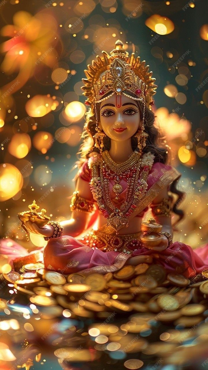 What stories does the gentle smile on Shri Lakshmi’s face tell? ✨ This stunning depiction of Vaishnavi, seated amidst a cascade of golden coins and holding the sacred lotus, radiates prosperity and divine grace. May her blessings fill your life with *shakti* and abundance! This beautiful image of Lakshmi Maa is a perfect reminder to invite positivity and wealth into your daily life. Make your phone a source of daily *darshan* with this serene image. 💖🙏