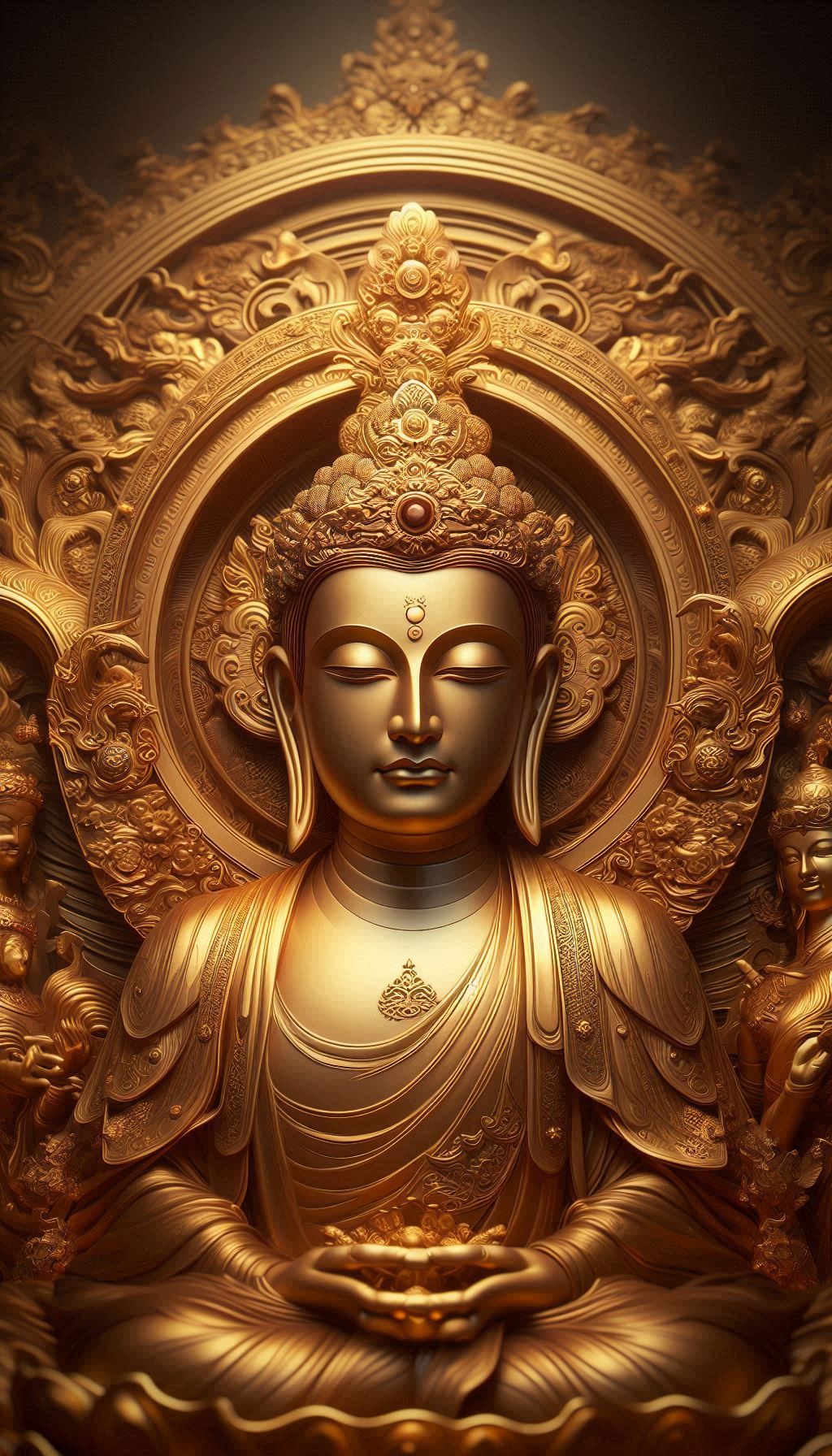 What stories does the gentle curve of Buddha’s lips tell? This stunning depiction of the Tathagata radiates a profound sense of peace and enlightenment. The intricate golden detailing and serene expression invite you into a space of calm reflection, reminding you to seek inner peace and wisdom in your own life. May this image bring you *darshan* and bless your phone with positive energy. 🙏✨ Let the Buddha’s wisdom guide your day! 🌟