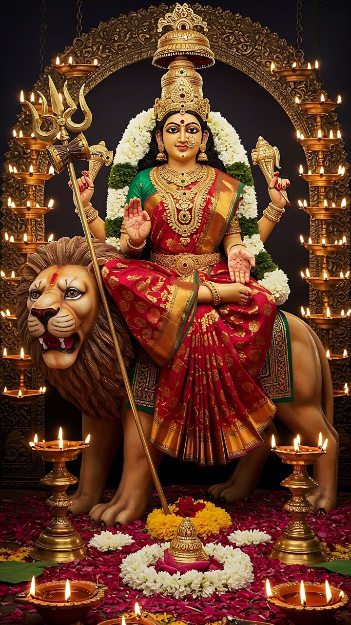 What a mesmerizing sight! Here, Mata Jagadamba is radiating pure *shakti* and grace, seated majestically on her vahana, the lion. The intricate gold jewelry and the vibrant red saree speak to her divine power and beauty. This image is a beautiful reminder of the protective energy of Ambe Maa in your life, bringing peace and blessings to your home. May this be your daily *darshan*, filling your heart with devotion. 🕉️✨🙏