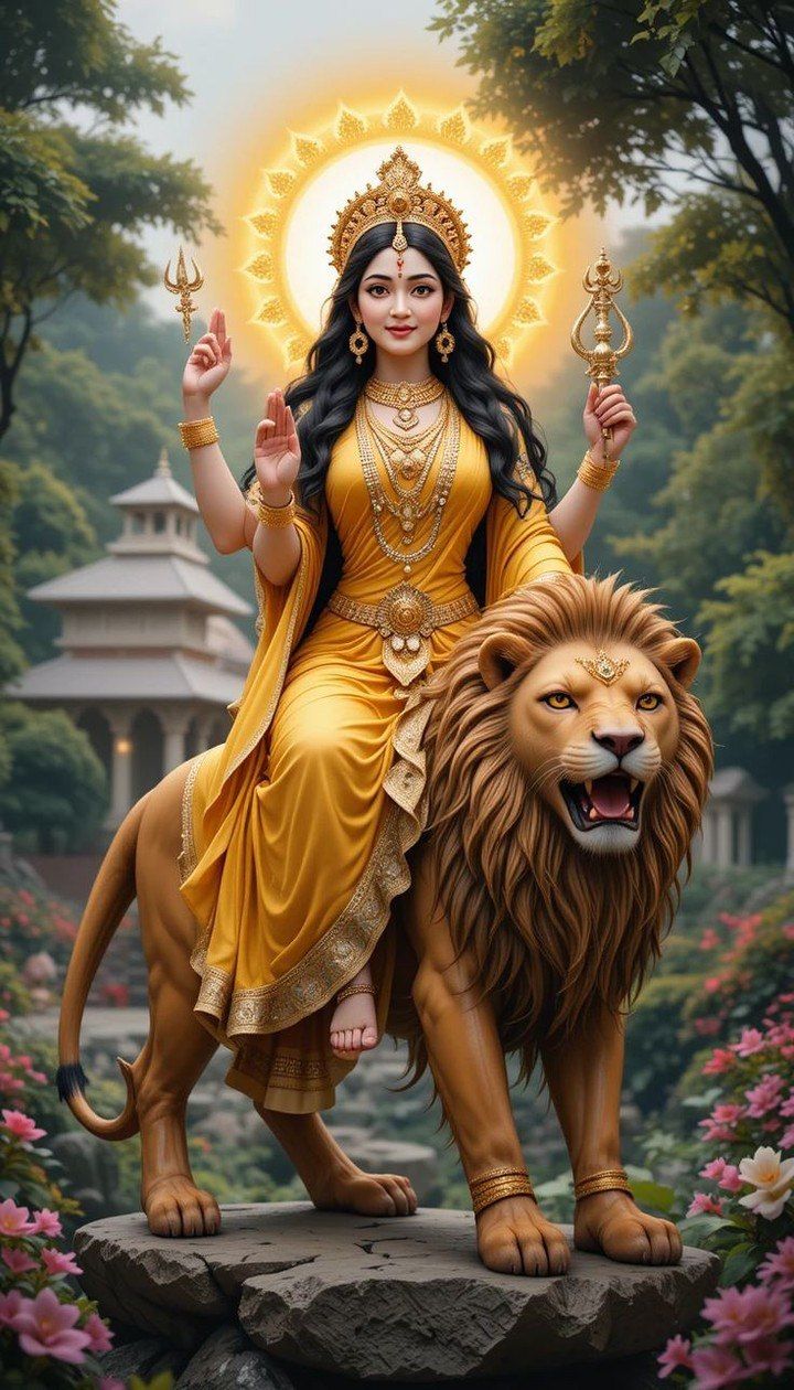 What a captivating sight! Jagadamba, radiating warmth and *shakti*, sits majestically upon her loyal *vahana*, the lion. The golden hue of her attire and the halo behind her symbolize divine energy and prosperity. ✨ Feel the blessings of Ambe Maa wash over you as you gaze upon this powerful image. This is a beautiful reminder of the divine feminine and her unwavering protection. May this image bring you peace, strength, and daily *darshan*! 🕉️🙏🌸