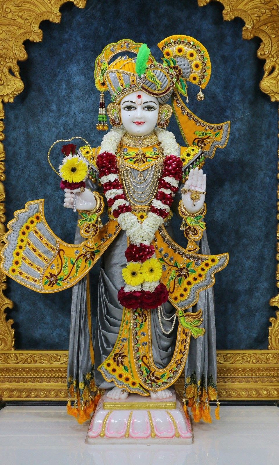 A sense of profound peace emanates from this beautiful murti of Swaminarayan Bhagwan. Look at the intricate details of His attire, adorned with shimmering gold and vibrant floral patterns – truly a sight to behold! Swaminarayan, as a beacon of dharma and bhakti, fills our hearts with joy. May His divine presence illuminate your day and bring you closer to spiritual peace. 🙏 Let this image be your daily darshan, a reminder of the divine love that surrounds you. ✨🧡