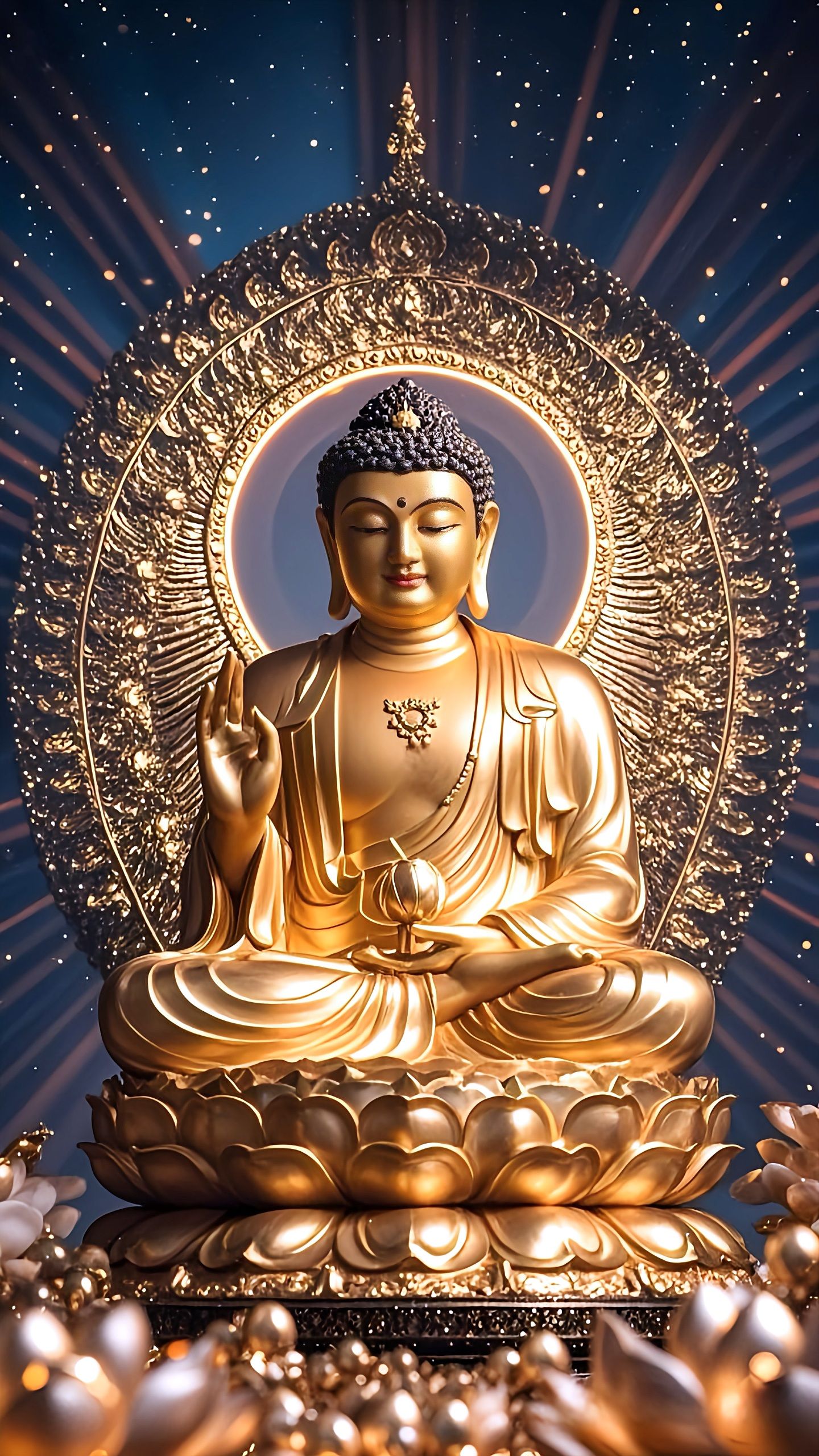 Behold the serene presence of Gautama Buddha, radiating peace and wisdom from the heart of enlightenment. ✨ The intricate golden halo surrounding him speaks volumes about his divine awakening, a beacon for all seeking liberation. This image invites you to pause, breathe, and connect with the profound stillness within. May his teachings guide your path towards *moksha* and inner peace. 🙏 Make your phone a portal to daily *darshan* and fill your life with *shanti*! 🕉️