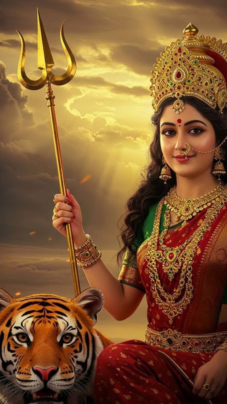 A sense of profound power emanates from this breathtaking image of Jagadamba! ✨ Her radiant form, adorned in a vibrant red saree and golden jewels, is a sight to behold. The majestic tiger at her feet symbolizes strength and courage, while the *trishul* she wields represents her ability to destroy all evil. May this darshan fill your heart with *shakti* and blessings, and may Ambe Maa guide you on your path. 🙏 Make your phone a portal to divine energy! 💖