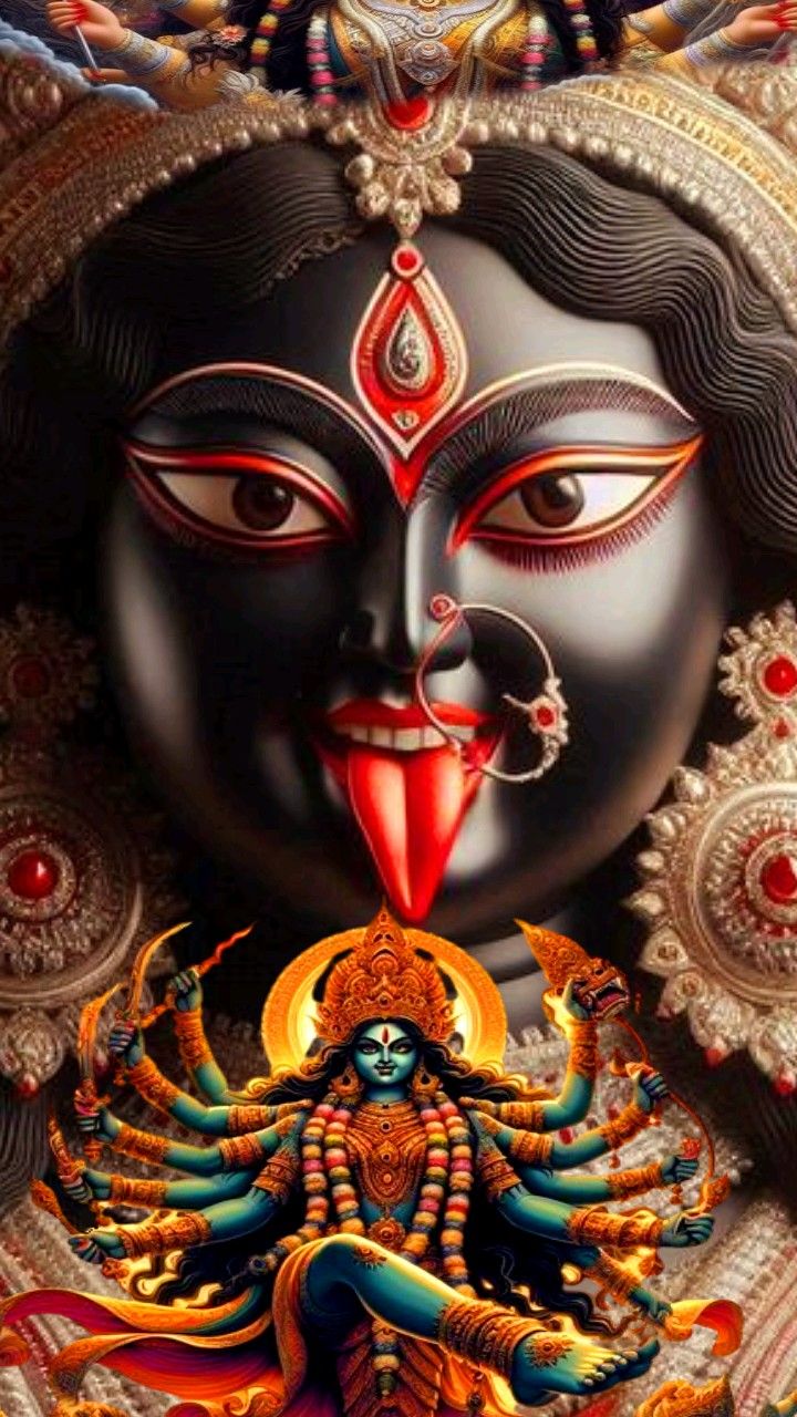 A sense of profound shakti emanates from this captivating depiction of Mahakali Maa. Her intense gaze pierces through illusion, and her multi-armed form symbolizes her boundless power to protect her devotees. The vibrant colors and intricate details invite you into a world of divine energy, reminding you of the strength and courage that lies within. May this image be a source of daily *darshan* for you, filling your life with blessings. 🕉️✨🙏
