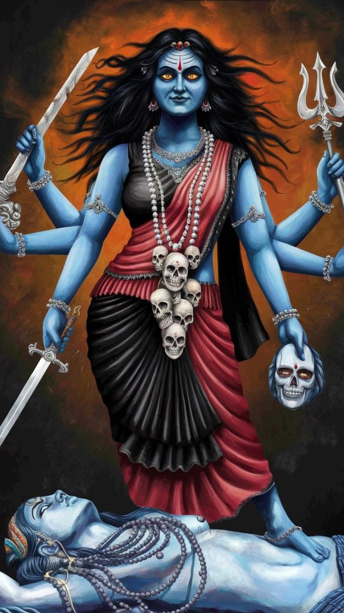 What a powerful darshan! This striking image showcases Maa Kali in all her glory, a vibrant embodiment of shakti and courage. The goddess stands triumphant over a defeated demon, her multiple arms wielding swords and a trident. The intensity in her eyes, the delicate details of her necklace, and the dramatic contrast of colors create a truly captivating piece. Let this image fill your phone with divine energy and remind you of the power within! 🕉️✨🙏