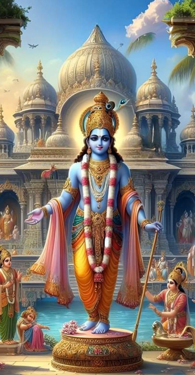 What a breathtaking sight! Lord Krishna, our beloved Kanhaiya, stands resplendent before his magnificent temple. The gentle curve of his flute hints at the melodies that fill the universe with devotion. His blue skin radiates an otherworldly glow, and the peacock feather adds a touch of playful grace. Allow this image to bring the blessings of Sri Krishna into your daily life, transforming your phone into a portal for *darshan*. 🙏💫✨