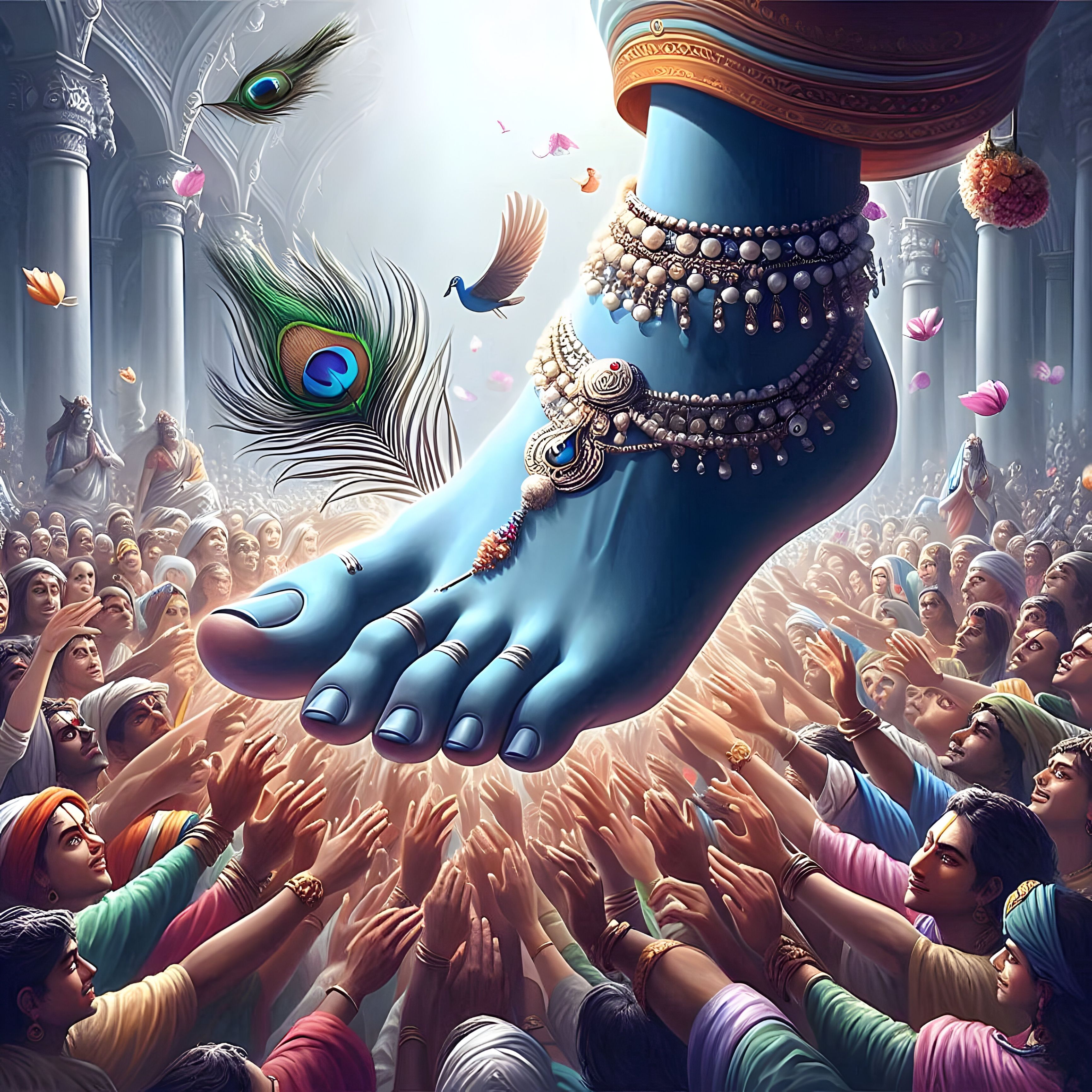 A sense of profound devotion emanates from this breathtaking image. The striking detail of Lord Krishna\'s blue foot, adorned with exquisite jewelry and a magnificent peacock feather, draws you into a world of bhakti and divine grace. The outstretched hands of eager devotees symbolize the deep yearning for connection with Kanhaiya. Feel the energy of this sacred moment, a reminder of the eternal love between the divine and his followers. Let this be your daily dose of *darshan*! πΈπβ¨