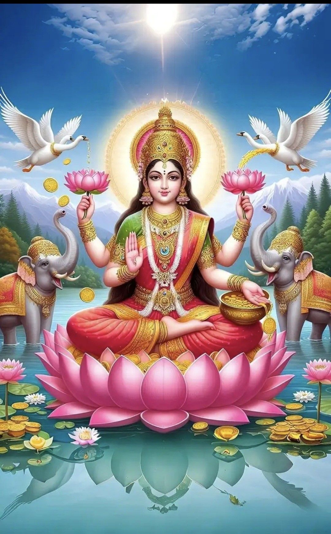 What a beautiful sight! Lakshmi Maa radiates prosperity and grace as she sits upon a magnificent lotus, surrounded by symbols of wealth and abundance. The gentle elephants showering her with water represent auspiciousness and purity. May this image bring *shakti* and positive energy into your life, filling your home and heart with blessings. Feel the divine presence and the promise of a bountiful future with each *darshan*. πΈππ