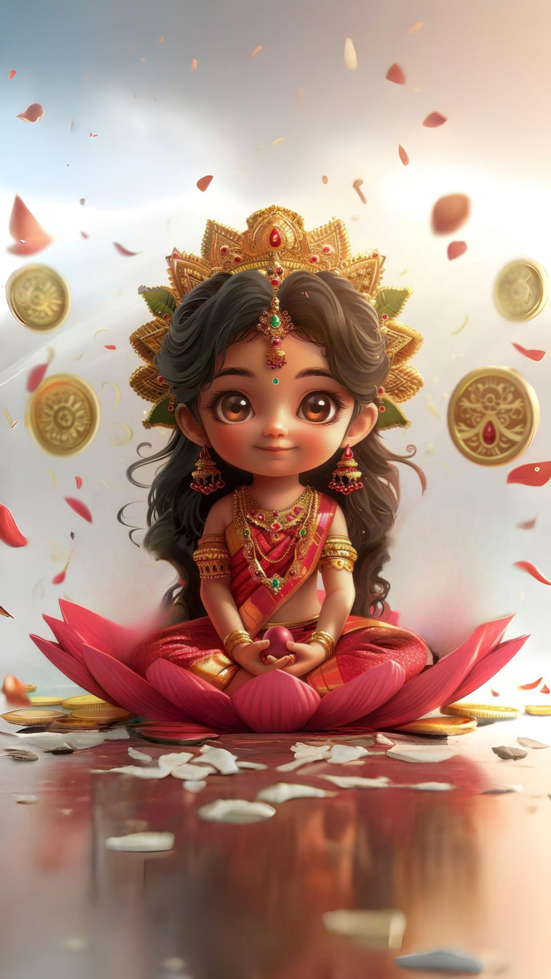 What stories does the gentle smile on Lakshmi\'s face tell? This captivating illustration portrays the Goddess of Wealth and Prosperity seated gracefully on a lotus, surrounded by a shower of golden coins and vibrant flower petals. The delicate detailing of her jewelry and traditional attire brings a sense of reverence and *shakti* to this beautiful image. May this *darshan* of Mata Lakshmi bring abundance and blessings into your life! 🌸💰✨