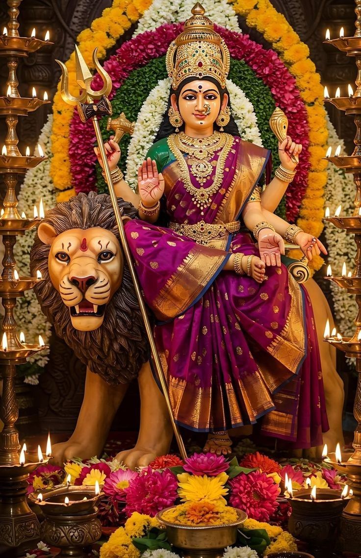What a stunning darshan of Ambe Maa! ✨ The goddess radiates strength and grace as she sits majestically upon her loyal lion vahana. 🦁 Her radiant presence, adorned with exquisite gold ornaments and a vibrant saree, truly captivates the soul. This image embodies shakti and divine protection. Allow this blessed image to bring peace and positive energy to your phone, making it a source of daily inspiration. 🙏
