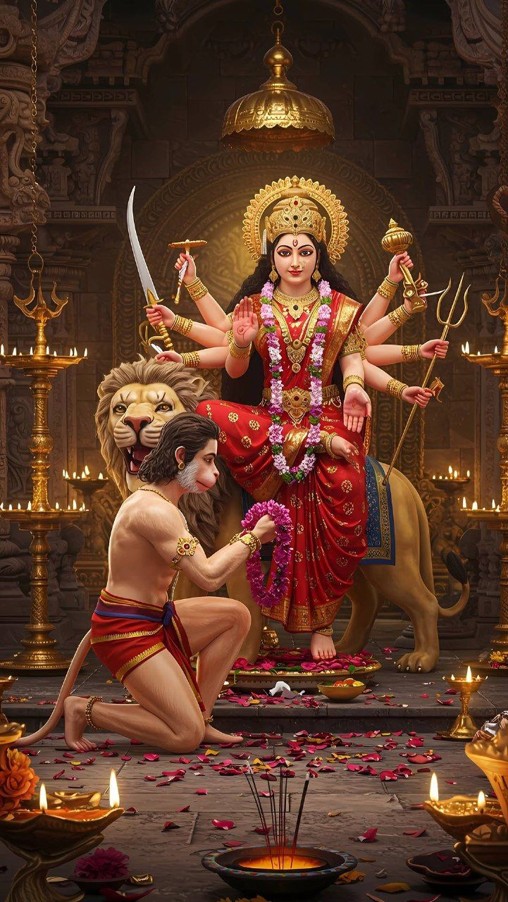 A sense of profound peace emanates from this stunning depiction of Maa Durga. Her radiant form, adorned in a crimson sari and exquisite golden jewelry, sits majestically upon her valiant lion, a symbol of her strength and unwavering *shakti*. A devoted bhakt offers his prayers at her feet, a testament to her compassionate heart. ✨ May this image bring *darshan* and blessings into your daily life, filling your home with positive energy and divine grace. 🙏 Make your phone a window to the divine, a constant reminder of the Mother’s loving presence. 🌸