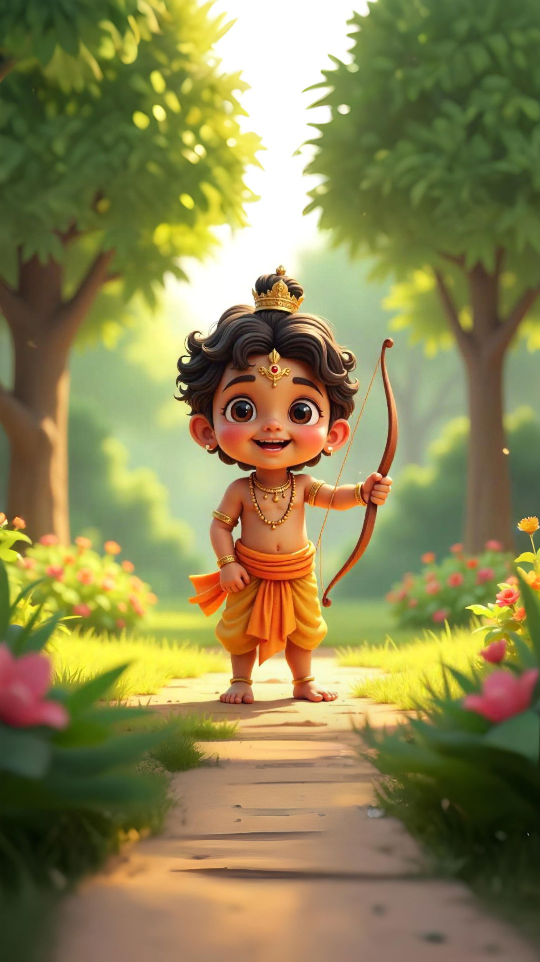 What a delightful sight! Little Ram, with a twinkle in his eyes, stands ready amidst a lush forest, his tiny bow held with determination. The golden light filtering through the trees gives the whole scene a magical feel, doesn’t it? It’s a beautiful *darshan* of our beloved Maryada Purushottam, a perfect reminder of courage and righteousness. Let this image bring a touch of childlike wonder and *bhakti* to your day. 😇 Make your phone a window to divine joy with a daily dose of such beautiful images! ✨