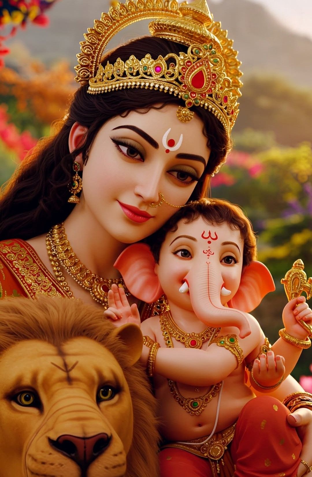 A gentle warmth radiates from this divine image, showcasing the loving bond between Maa Parvati and her beloved son, Ganesha. Her eyes hold the universe, a deep and comforting *shakti*, while little Ganpati nestles close, offering a playful glimpse of his endearing charm. The intricate gold jewelry and vibrant red attire speak of auspicious blessings and unending love. May this *darshan* fill your days with peace and devotion. ππΈβ¨ Let the divine mother\'s grace illuminate your world.