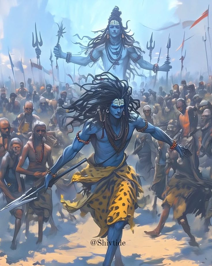 Witness the awe-inspiring power of Mahadev as he leads the charge! This stunning depiction showcases Bholenath in his warrior form, amidst a celestial battlefield. The intense blue of his skin and the dynamic energy emanating from the image draw you into the heart of the cosmic struggle. Feel the shakti flowing through every detail, reminding you of the divine protection and strength Mahadev offers. May this image bring you daily *darshan* and inspire you on your path. 🕉️🙏✨