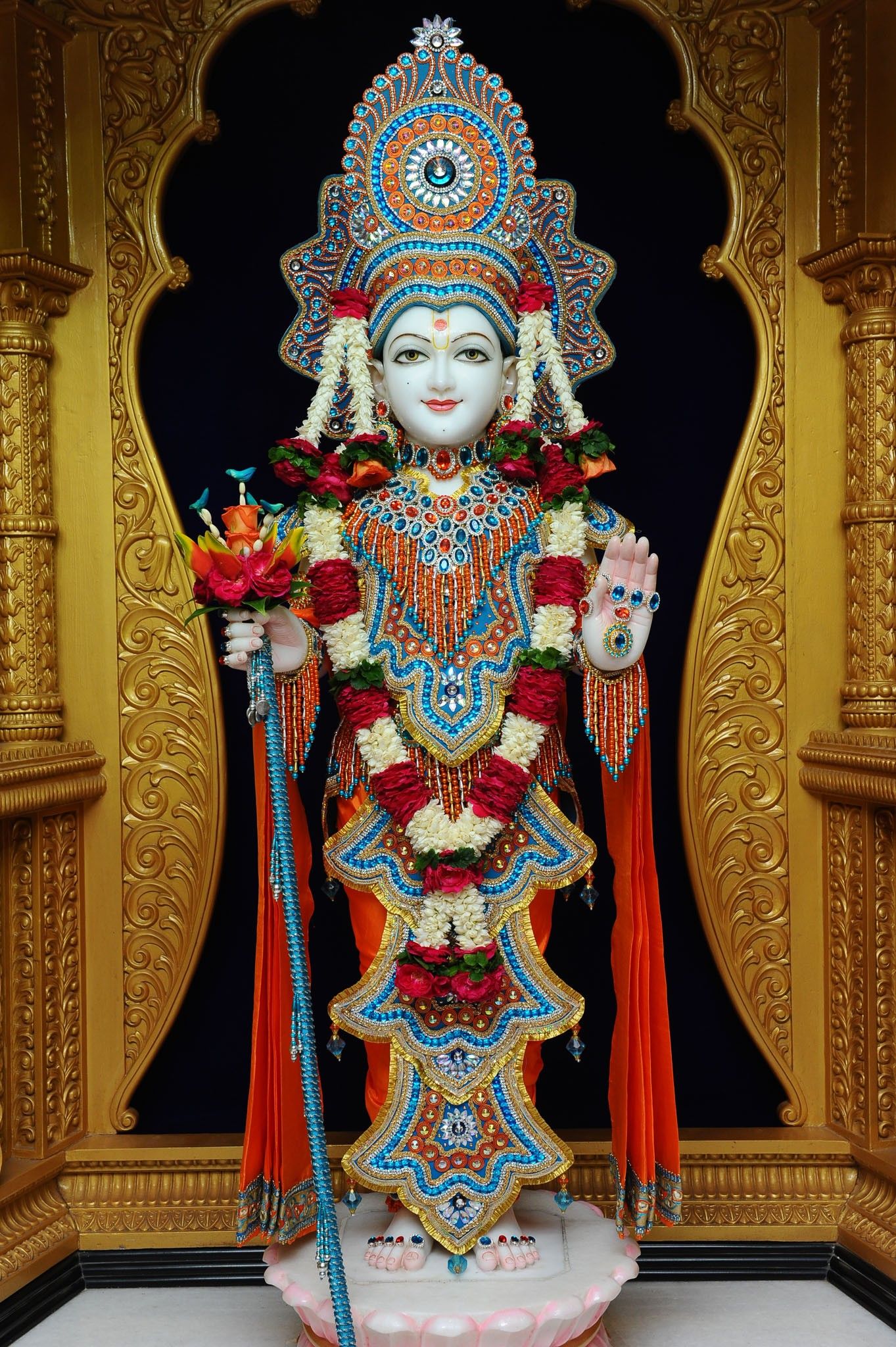 What a stunning darshan of Shree Swaminarayan! This image captures the divine presence of the beloved Bhagwan, adorned with vibrant floral garlands and dressed in exquisitely detailed traditional attire. The golden frame enhances the deity\'s radiant glow, inviting you to immerse yourself in bhakti and feel the peace within. May this image bring blessings and spiritual energy to your day, transforming your phone into a sacred space for daily connection. 🙏💖✨