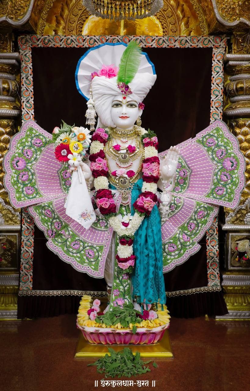 Behold the divine presence of Swaminarayan, adorned with exquisite floral garlands and a majestic headpiece! His gentle gaze and serene posture radiate peace and spiritual bliss. This beautiful murti evokes a sense of profound *bhakti* and invites you into a deeper connection with the divine. May Swaminarayan\'s blessings fill your life with joy and dharma. π Make your phone a portal to daily *darshan* with this image! πΈβ¨